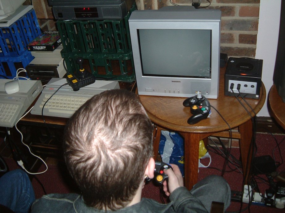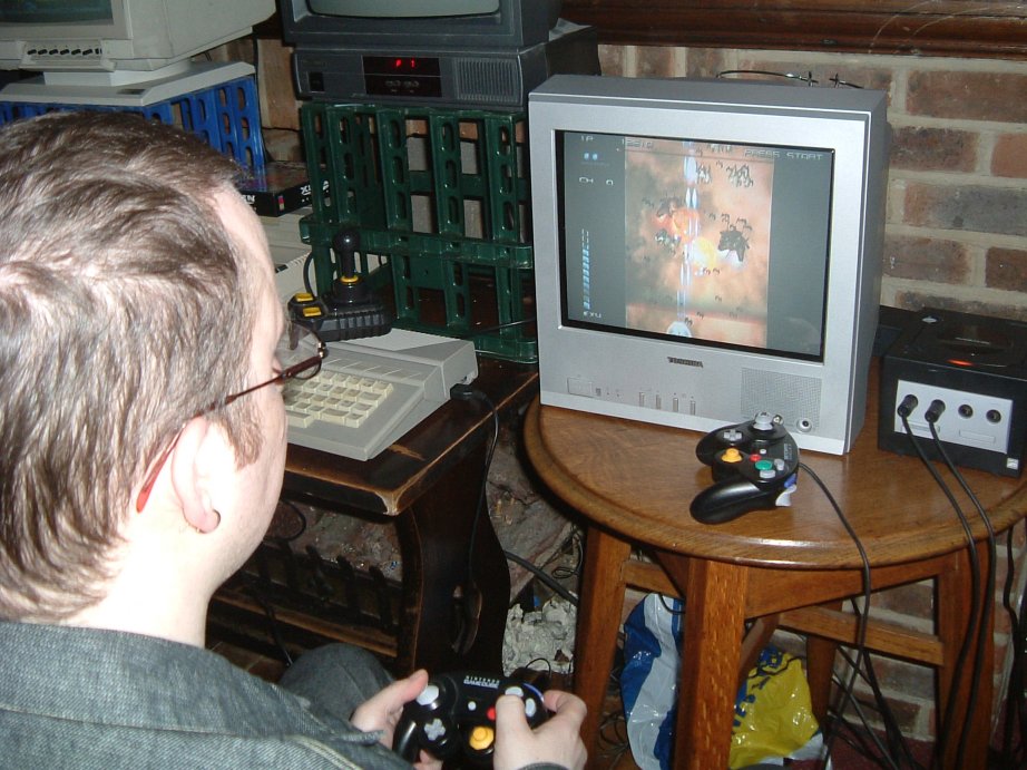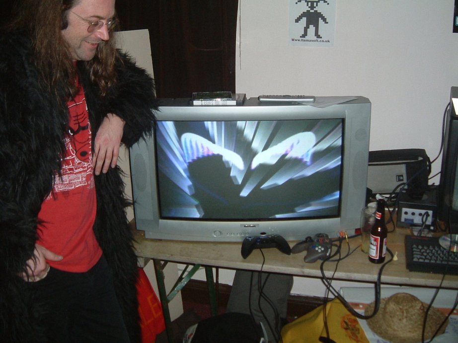 Upon our return, LANs played some glossy shoot-em-up on the GameCube (which looks a stunning machine, but the game looked like another 194x with super-silky graphics). I tried out a few other games: Xenon2, which I couldn't really remember how to play, but for which I was told "you're supposed to hit the ball things, Dave".
