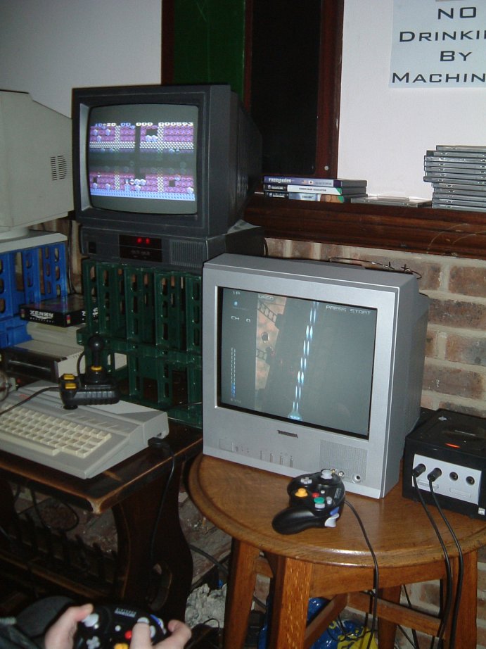 Further towards the corner it looked like someone playing Regulus under MAME on a TFT screen and X-Arcade, and the end wall had another selection of home machines, amongst them a Vic20 (playing GridRunner) and C64.