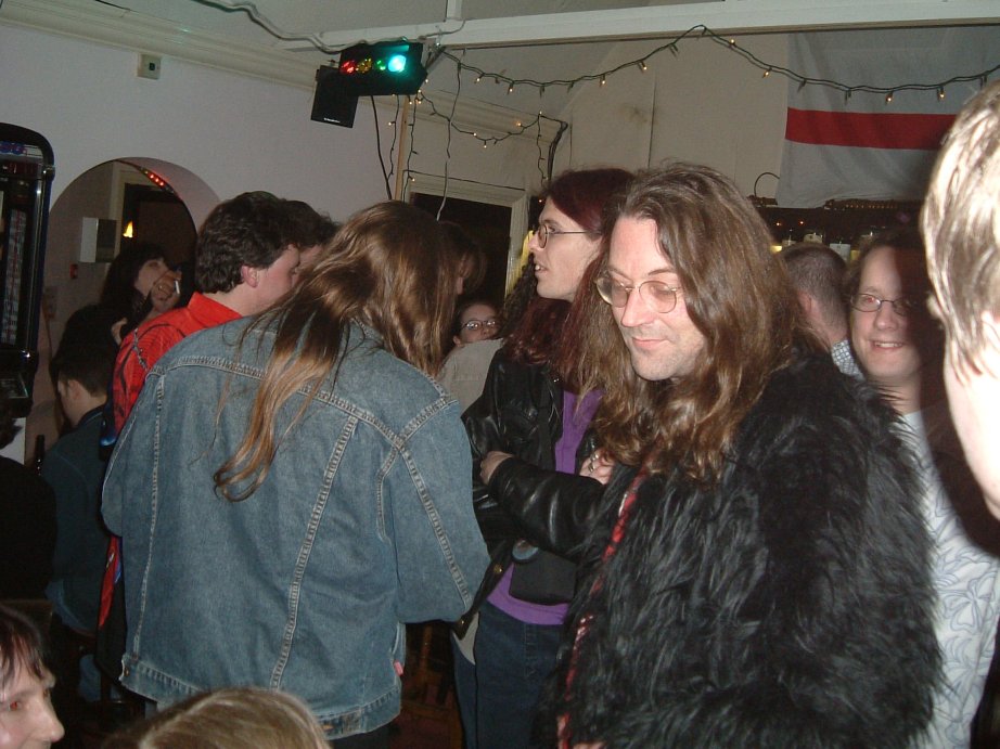 The top of the stairs was manned by a bouncer with a green head - we knew we were in the right place, here. In the doorway was a visitors' signing board which quickly gained our obligatory "we woz ere" scrawl and we headed into the noisy fray.